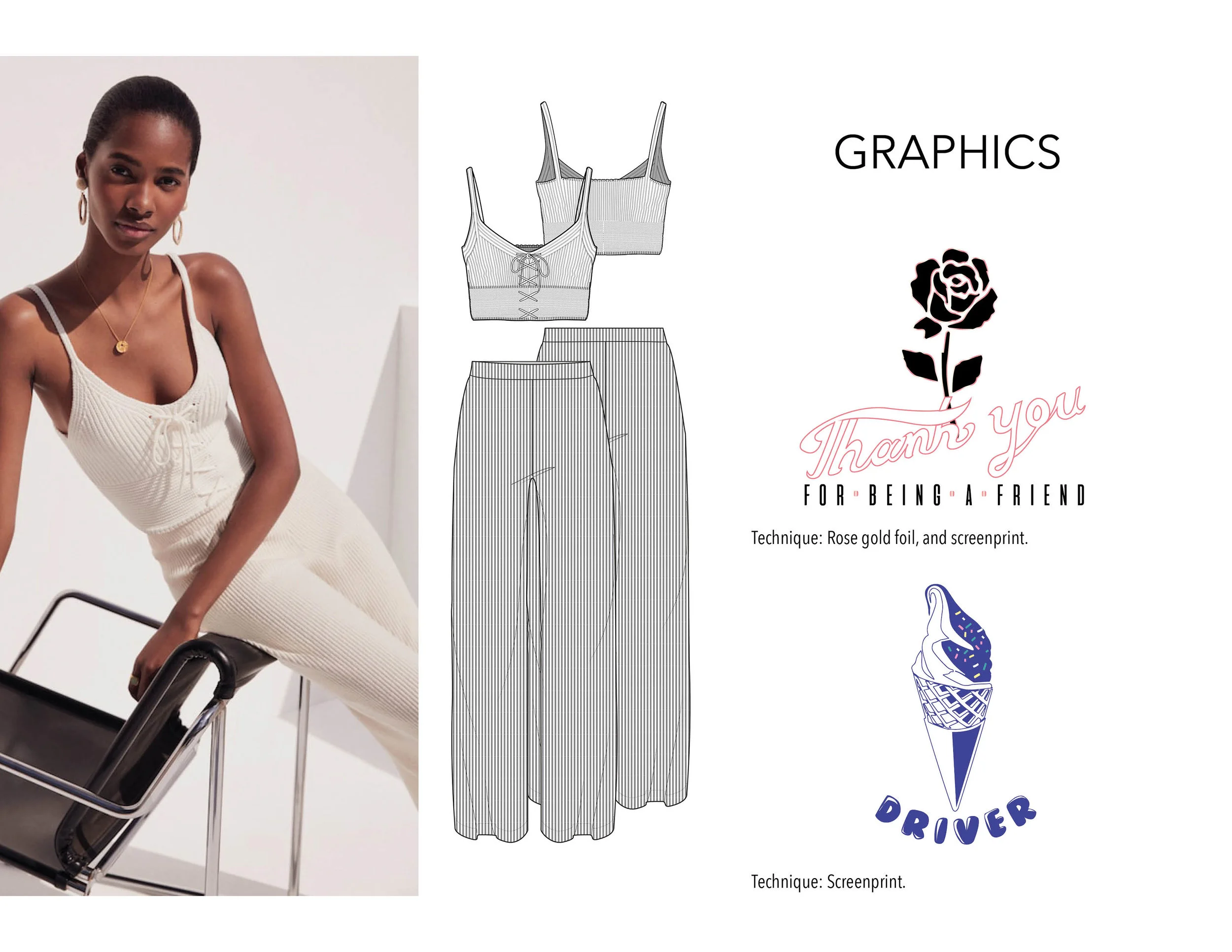 Here, I created flat sketches from an outfit I found on Mango’s website. I designed these two graphics on the right, to relate to the younger junior market graphics I’ve been seeing in stores and online. Program used was illustrator.